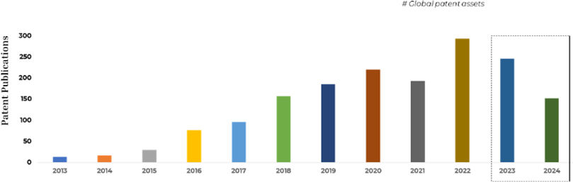 However, only a fraction of these assets has matured into granted patents, while the vast majority remain under examination. This indicates that the field is still structurally unsettled, with claim boundaries, ownership strength, and freedom-to-operate positions continuing to evolve.