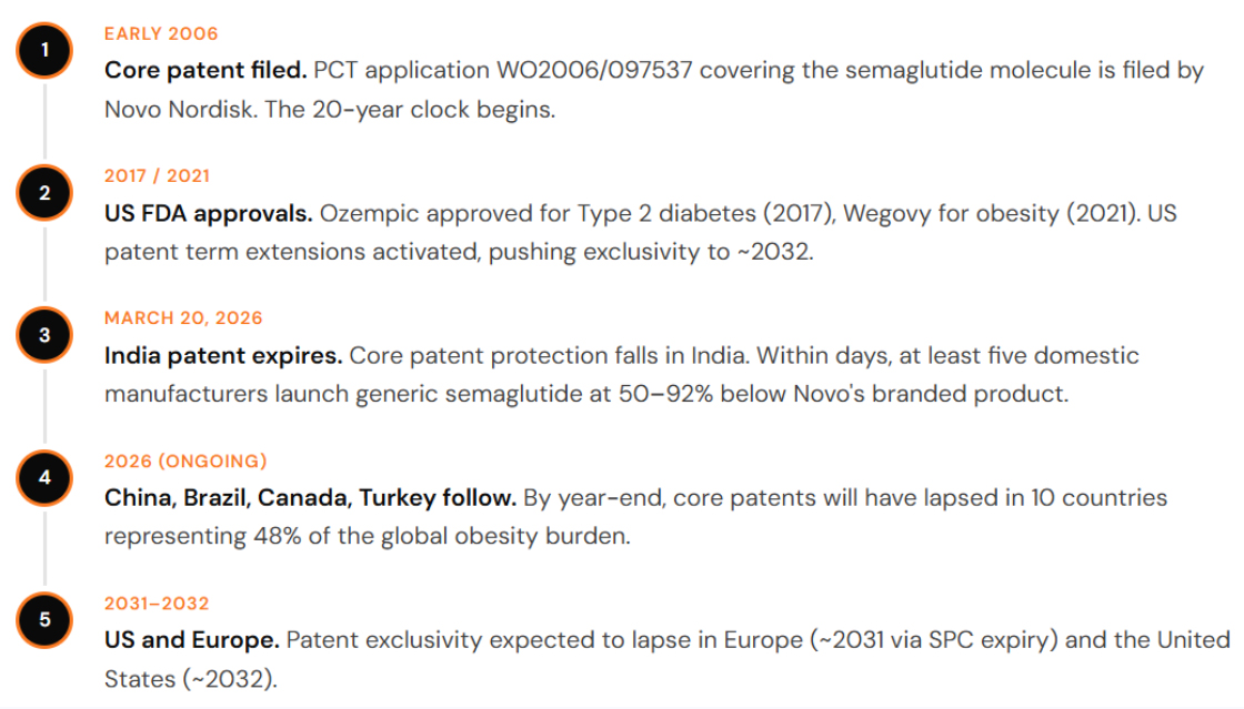 It is worth noting that the expiry of the core patent does not automatically clear the field. Novo Nordisk holds a portfolio of secondary patents covering formulations, delivery devices, and dosing regimens. In India, China, and Brazil, several generics companies are pursuing a “skinny label” strategy launching for indications not covered by any surviving secondary patent while challenging the rest through litigation. The road is open, but it is not unobstructed.