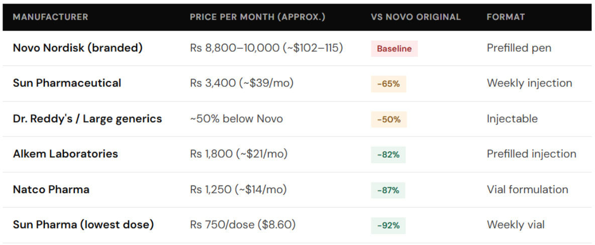 Following the weakening of semaglutide patent protection in India, multiple domestic manufacturers including Sun Pharmaceutical, Dr. Reddy’s Laboratories, Natco Pharma, and Alkem Laboratories have entered the market with significantly lower-priced alternatives to Ozempic. While larger players are offering products at roughly ~50% below Novo Nordisk’s original pricing, smaller manufacturers have pushed prices down by as much as ~80–90%, with the lowest-cost options representing a reduction of up to ~90% compared to pre-expiry branded levels.
